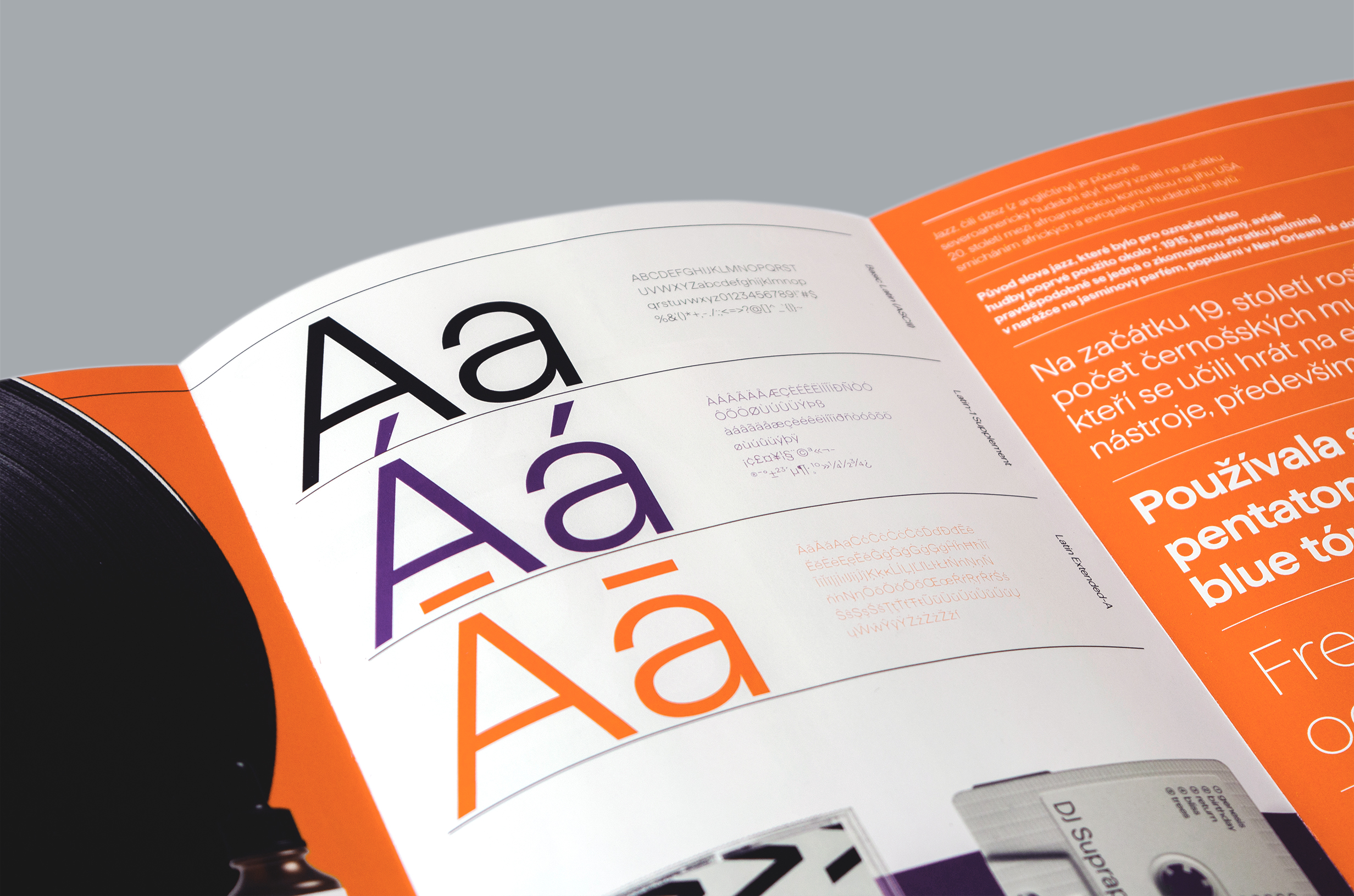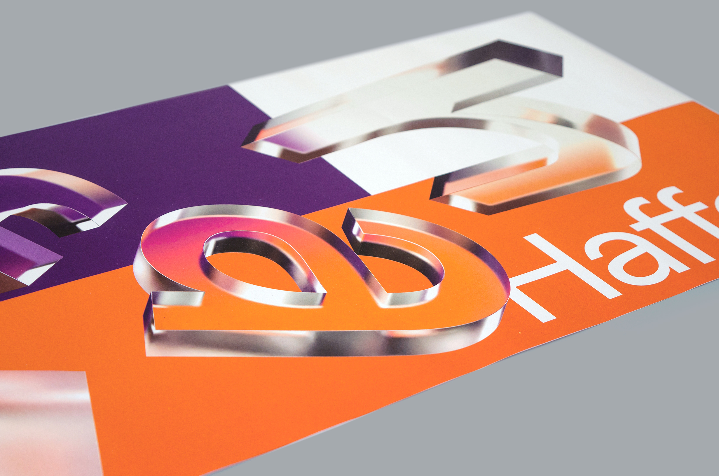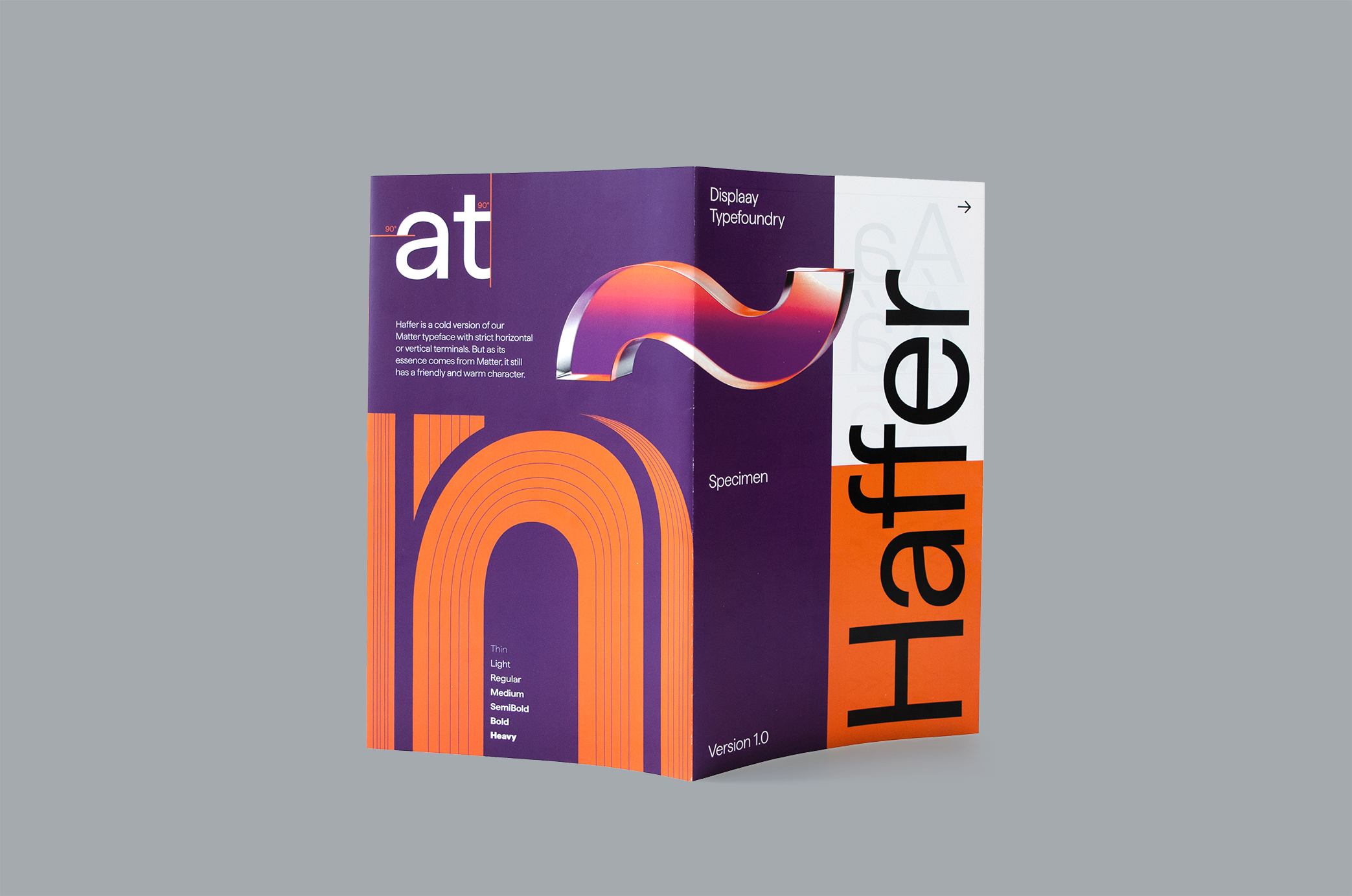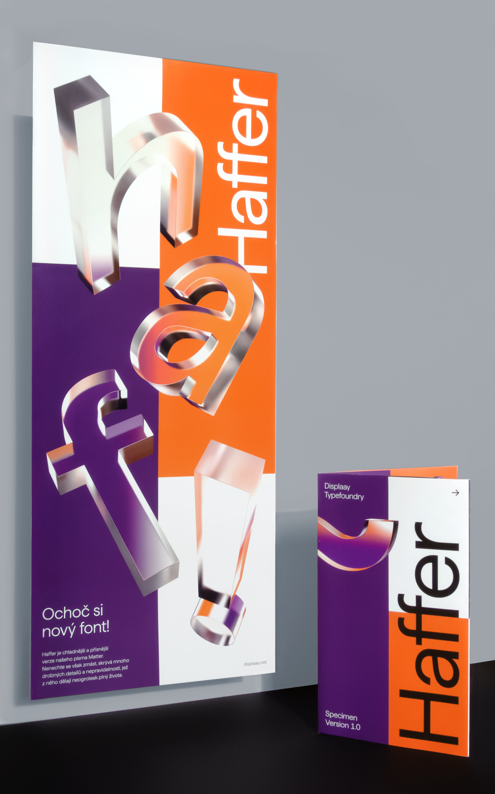 Final project of typography class. The goal was to use the same format (330 × 762 mm) both for the poster and the pamphlet. I have chosen Haffer typeface by Czech typefoundry Displaay. Going off its strict neo-grotesque nature, I applied bold grid and color system, upon which 3D elements (with corresponding sharp edges) float freely. The text on the poster "haf!" is a playful spin on typeface's name: it's an onomatopoeia for a bark.